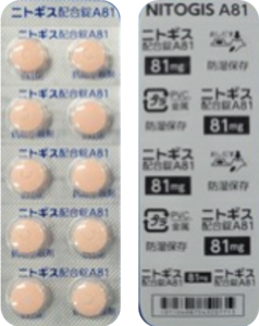 後発品 81mg1錠 ニトギス配合錠A81 淡橙色の素錠/わずかに芳香を有する 直径/長径/垂線/長辺(mm)
