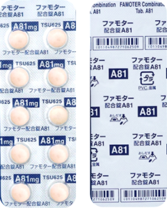 後発品 81mg1錠 ファモター配合錠A81 淡橙色の二層錠裸錠/アスピリンと制酸緩衝剤(ジヒドロキシアルミニウムアミノアセテート及び炭酸マグネシウム)をそれぞれ別の層に配合した二層錠でオレンジの香味をもつ 直径/長径/垂線/長辺(mm)