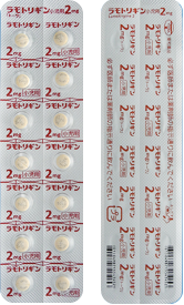 淡黄白色の素錠 | 割線入り | 直径/長径/垂線/長辺(mm) 5 厚さ(mm) 2 重さ(mg) 40 印字(企業マークは除く) ラモトリ 2/ラモトリギン トーワ 2 |